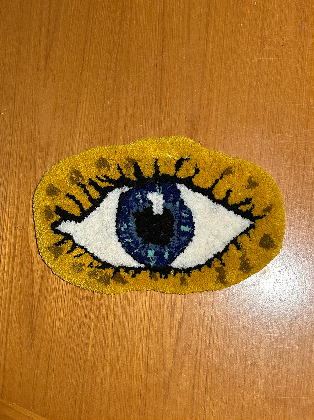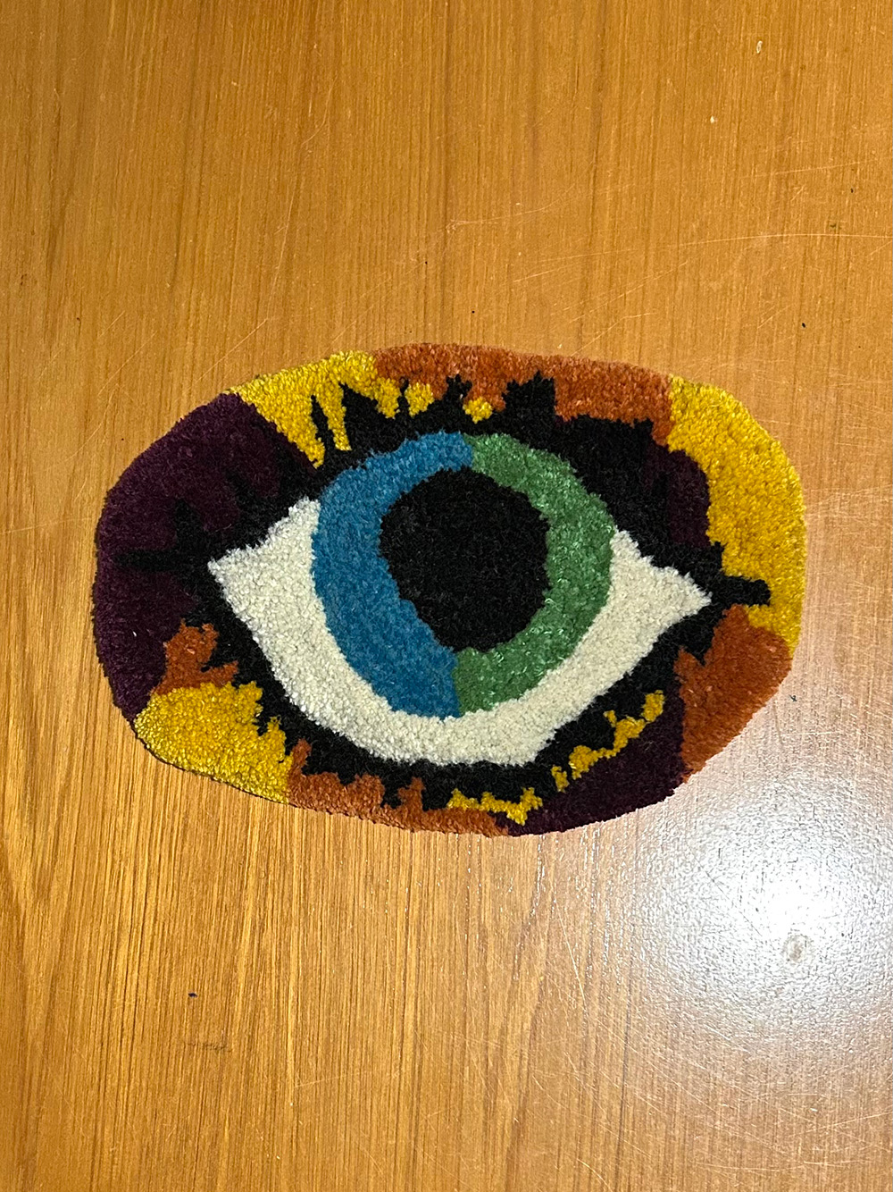 These rugs were made in that space. The designs were created in collaboration with Midjourney AI by fine-tuning hundreds of language prompts. These AI-designed rugs were then created by hand using a tufting gun and reclaimed and thrifted wool. Some rugs are in the form of technological objects to heighten the contrast with the ancient and tactile art of rugmaking. Others feature Midjourney AI's interpretation of aspects of digital society.